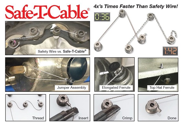 Safe-T-Cable is constructed of high tensile strength, stranded cable. It is more flexible than safety wire and provides a stronger assembly. The process of installing safety wire remains awkward and costly. The removal and rework of installed safety wire is a common occurrence that requires significant time and operator expertise. SAFE-T-CABLE was invented to address these problems.
