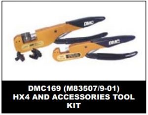 The DMC169 Tool Kit contains the HX4 (M22520/5-01) associated Die Sets for MIL-Spec shielding ferrules?(MS21980/MS21981) and MIL-Spec coaxial contacts (MS39029/6/13/14, M39029/7/8, M83733/13/14 and 0N089558). The kit is supplied in a metal case with foam inserts, contoured tool cavities, laminated instruction sheets permanently attached on a ring binder, and contents charts identifying the location of each tool. The DMC169 kit supplies your staff with the information and accessories necessary to use your HX4 (M22520/5- 01) tools for crimping.
