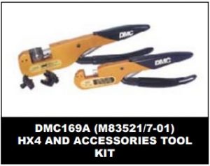 The DMC169A Tool Kit contains the HX4 (M22520/5-01) associated Die Sets for MIL-Spec shielding ferrules (MS21980/MS21981) and MIL-Spec coaxial contacts (MS39029/6/13/14, M39029/7/8, M83733/13/14 and 0N089558). The kit is supplied in a metal case with foam inserts, contoured tool cavities, laminated instruction sheets permanently attached on a ring binder, and contents charts identifying the location of each tool. The DMC169 kit supplies your staff with the information and accessories necessary to use your HX4 (M22520/5-01) tools for crimping.