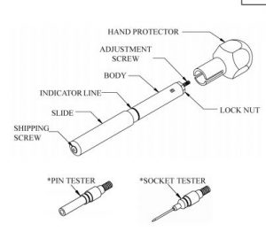The tester tips are colour coded for specific sizes (AWG 8, 12, 16, 20, 22, 23, 24, & 26) and designated for pins or sockets (see Chart B). Use pin end tips to test sockets and socket end tips to test pins. All tips are made of aluminium and are replaceable. A nylon hand protector is provided with each tool body. The tools are adjustable and can be preset at the factory to your request.