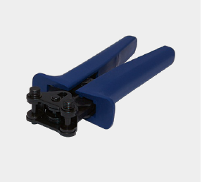 Mechanical press tool with exchangeable press-head dies for various contacts and wire cross sections.