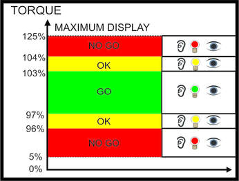 Featuring an innovative “Go-NoGo” alert indication, the First Peak mode provides quick identification of click-type wrench setting. Geared toward validating the exceptional accuracy of the Digitool Solutions’ “C” model micrometer adjustable wrenches, “click” accuracy within +/-3% of setting shows a green indication, within +/-4% a yellow indication and greater than +/-4% a red indication. See the example diagram below: