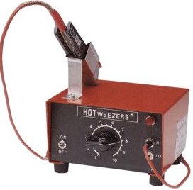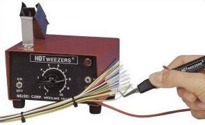 Hotweezers represents the state of the art in design and construction of thermal wire strippers. The hand unit is shaped like a pair of cutoff tweezers and weighs less than 58g. including cable and connector.